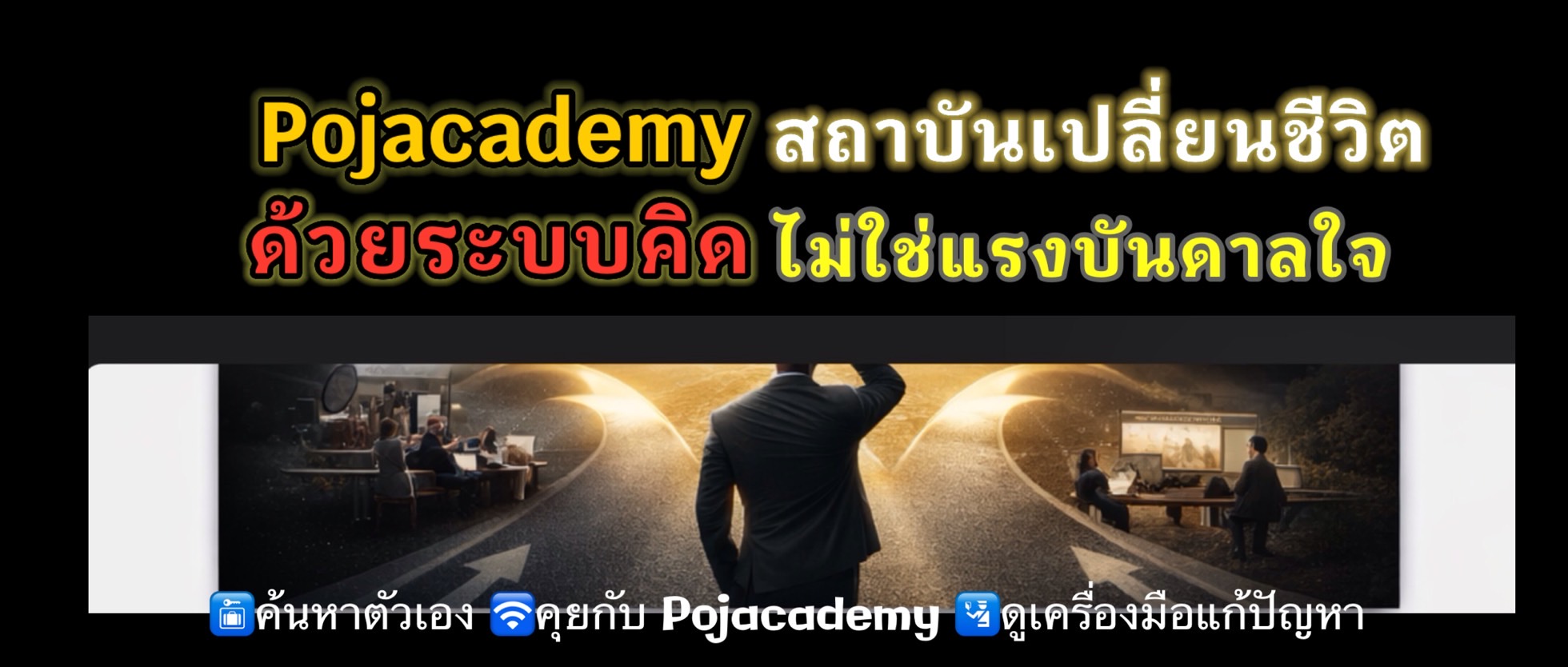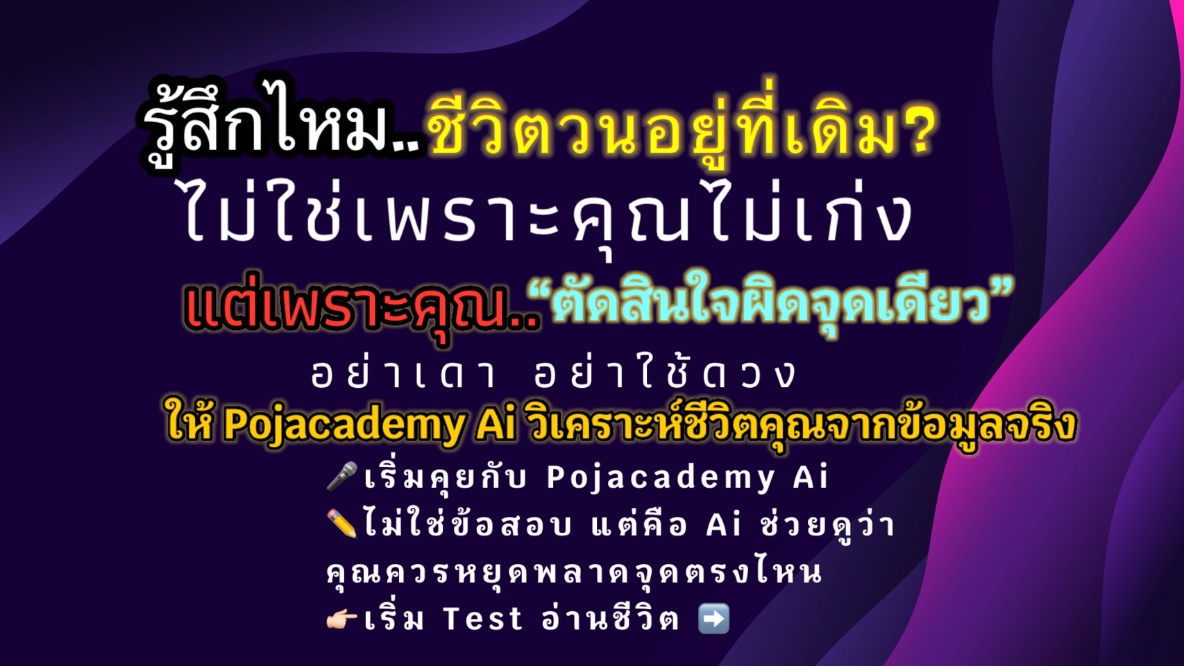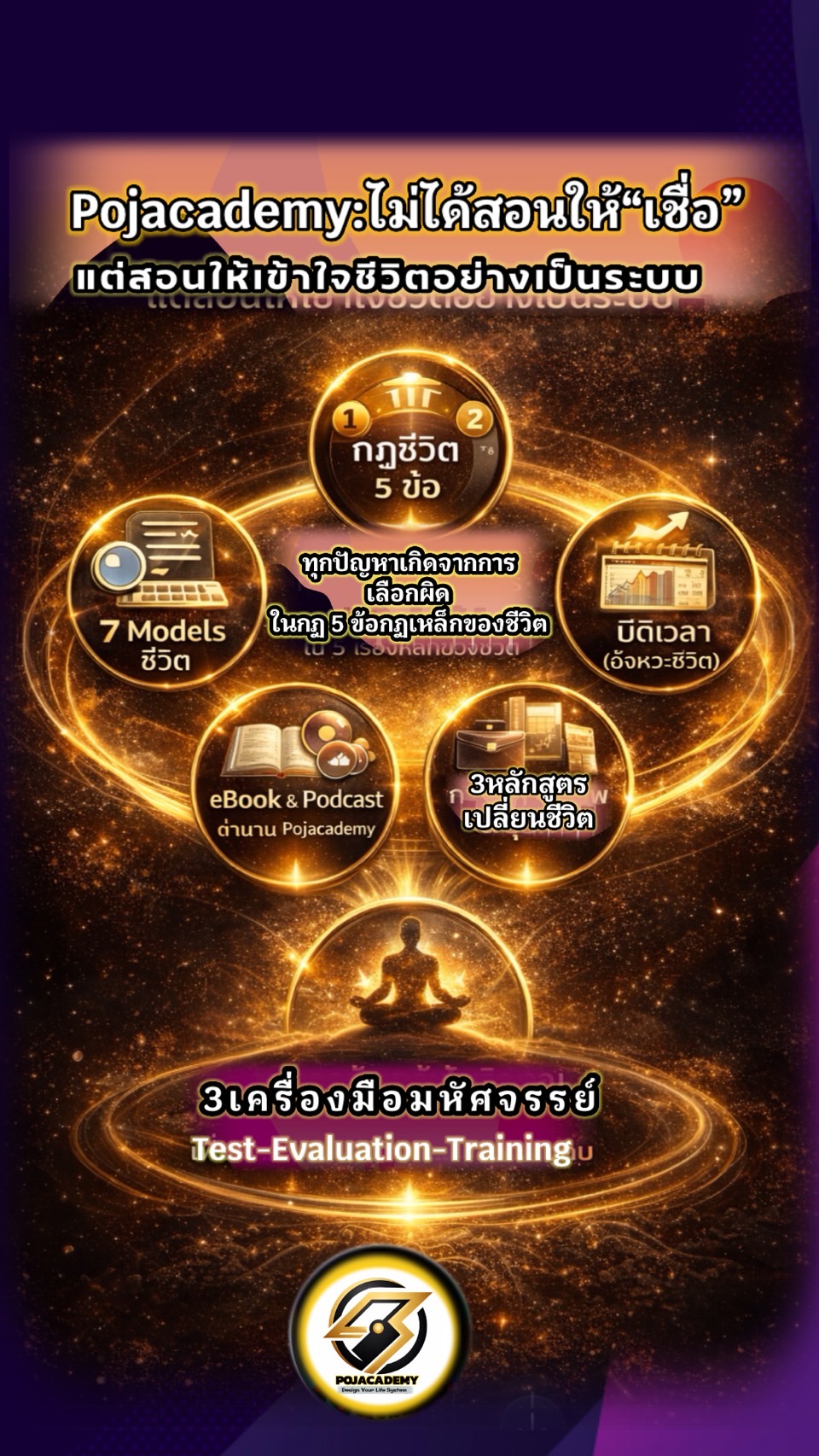 Pojacademy คือแพลตฟอร์มระบบช่วยตัดสินใจชีวิต (Life Decision System) ที่ออกแบบมาเพื่อช่วยให้มนุษย์ตัดสินใจเรื่องสำคัญ 5 จุดใหญ่ของชีวิตได้อย่างถูกจังหวะ ถูกตัวตน และลดความผิดพลาดซ้ำซาก