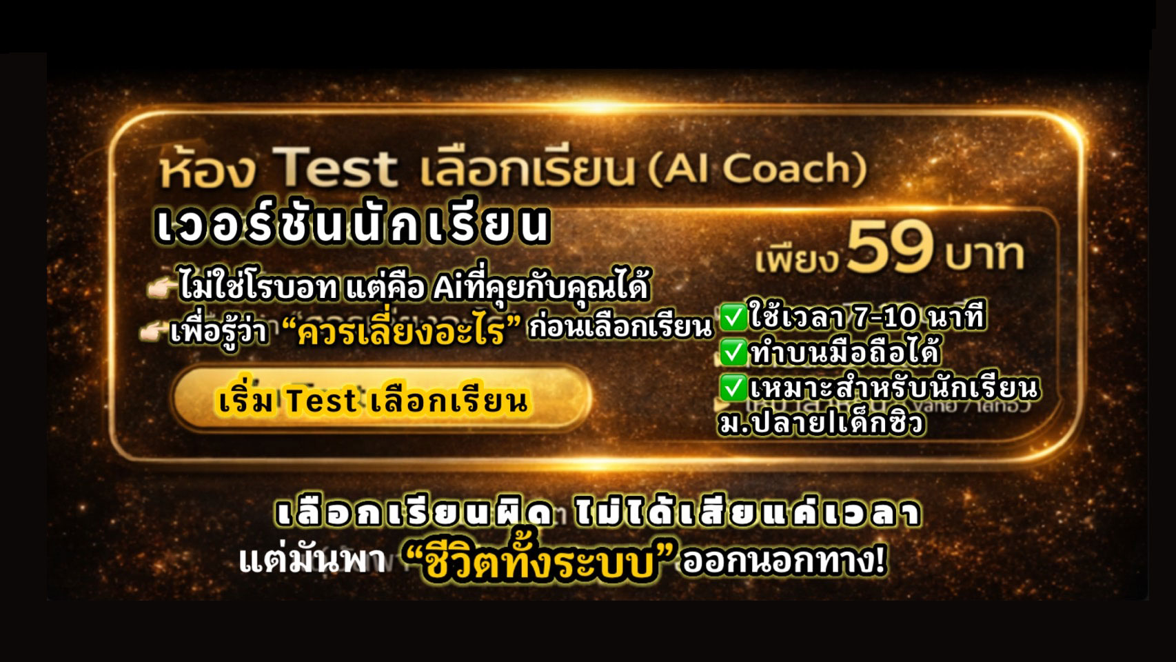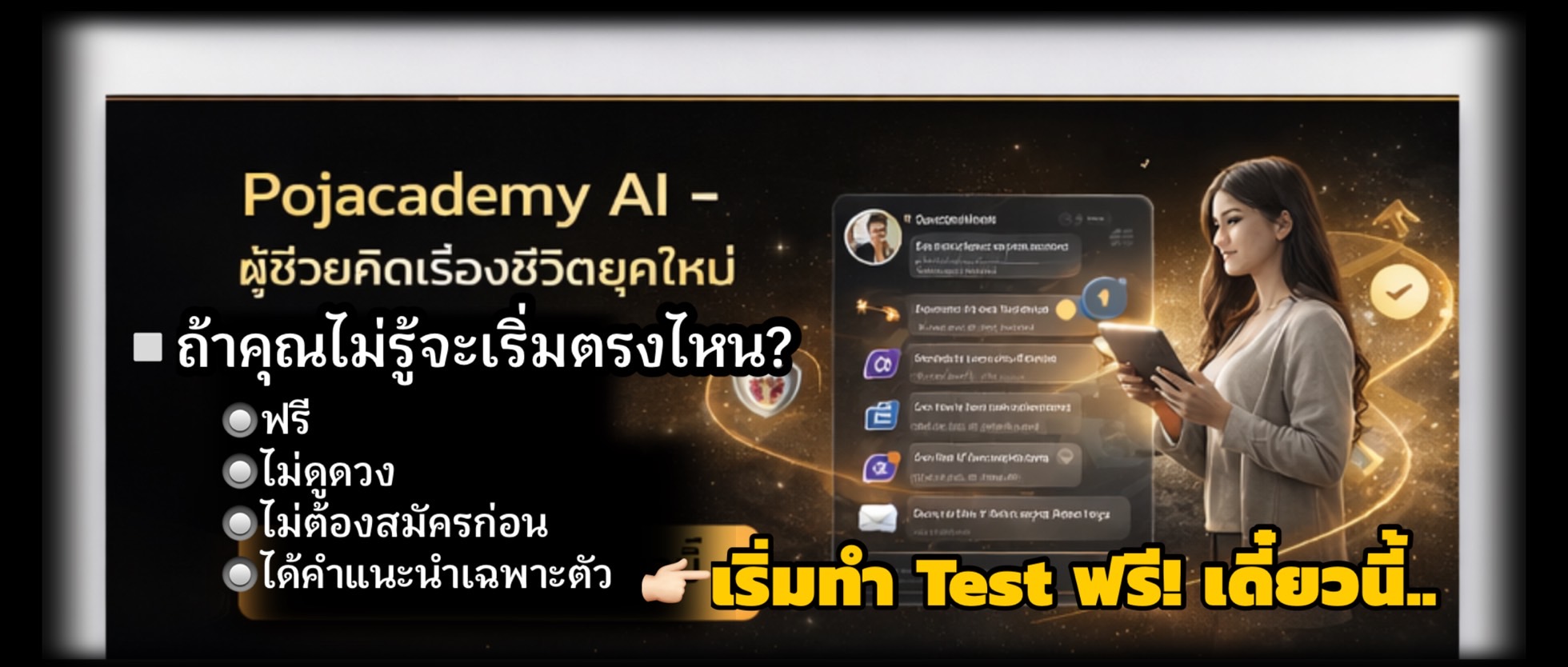มาจาก LINE ใช่ไหม? เริ่มตรงนี้ก่อน คำอธิบาย: เริ่มจาก Test ค้นหาตัวเอง ก่อนตัดสินใจเรื่องสำคัญ ระบบจะพาไปต่อที่ POJ AI วิเคราะห์ชีวิต อัตโนมัติ ปุ่มหลัก (ปุ่มเดียว): ข้อความปุ่ม: เริ่มทำ Test ลิงก์ไปที่: 👉 http://www.pojacademy.com/search_model_center.phpไม่ขาย ไม่เร่ง : ใช้เวลาไม่นาน